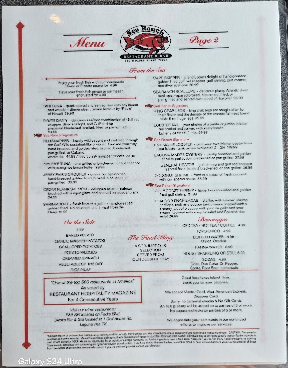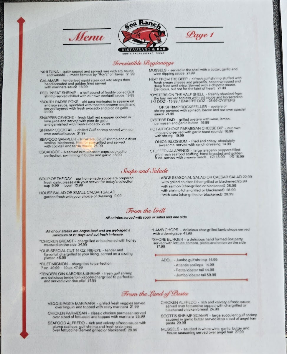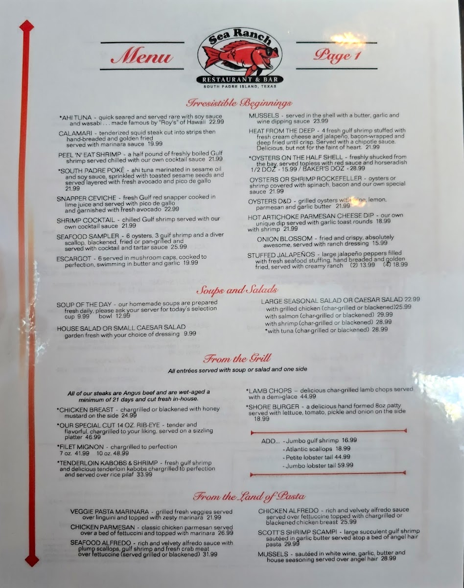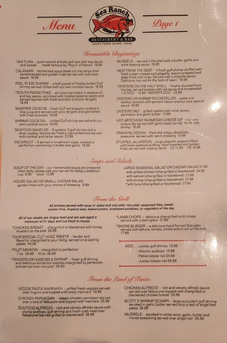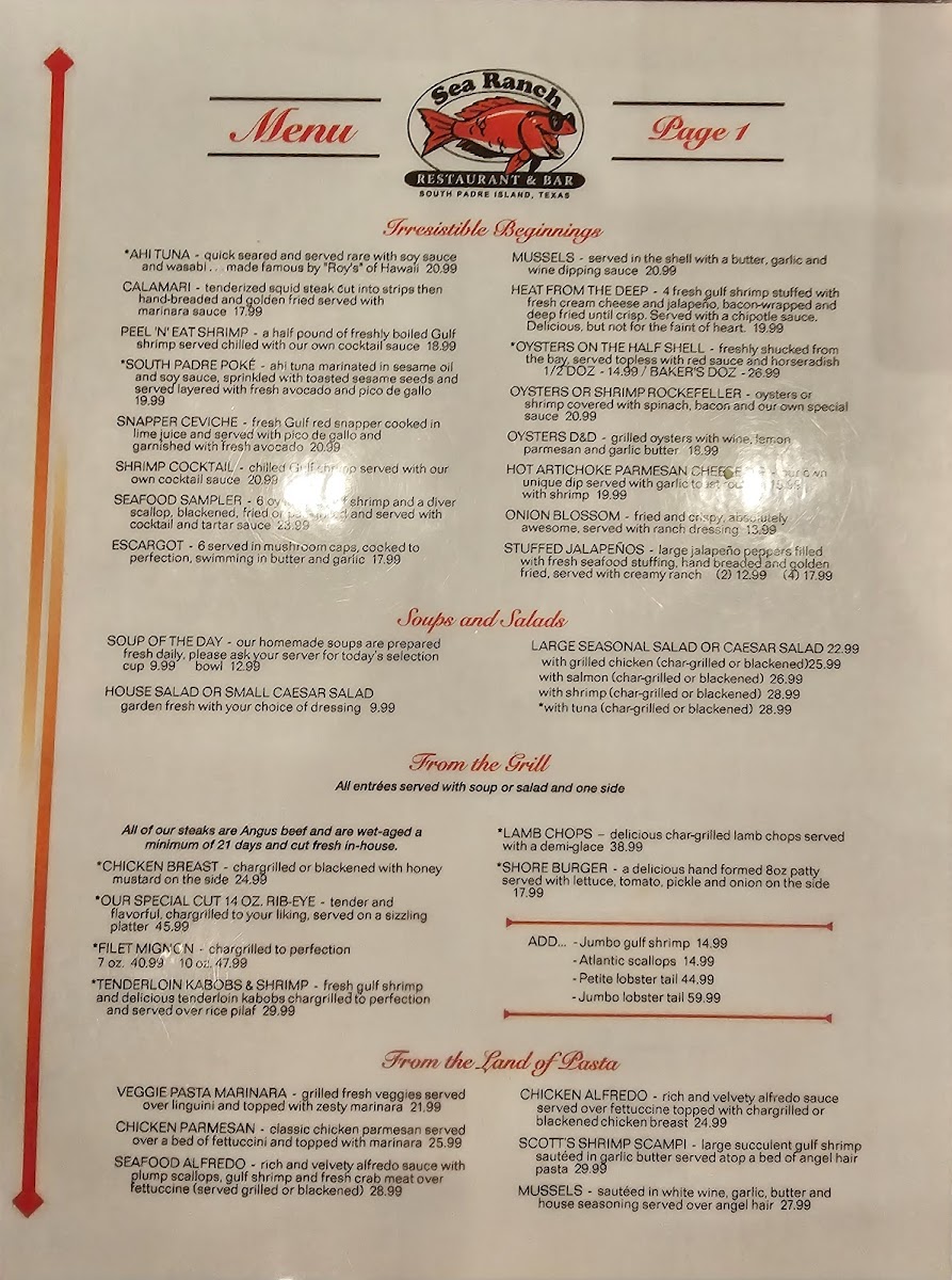 At the heart of South Padre Island, you’ll find the delightful Sea Ranch Restaurant, a local favorite known for its coastal charm and delicious menu offerings. The moment you step inside, the relaxed atmosphere invites you to unwind and savor the wide variety of dishes available. From fresh seafood, perfectly prepared steaks, to flavorful sides, there’s something for every taste. Whether you're enjoying a laid-back lunch or a cozy dinner with loved ones, the Sea Ranch Restaurant Menu has all your cravings covered. Signature dishes feature a perfect balance of local flavors, and the daily specials are always worth exploring. You can’t go wrong with any choice here, as each dish is made with care and the freshest ingredients. Whether you’re a regular or first-time visitor, there’s a dish waiting to please every palate.