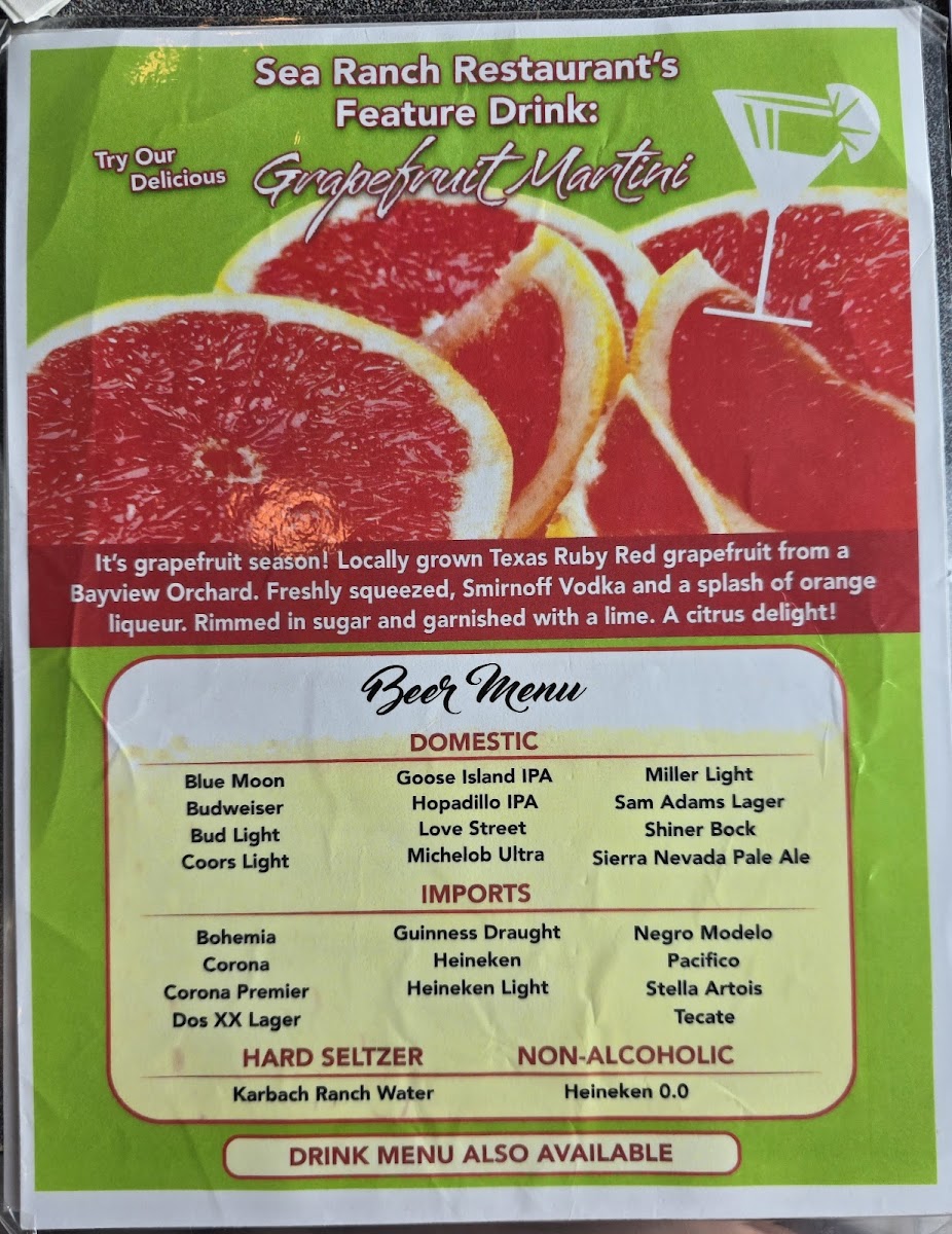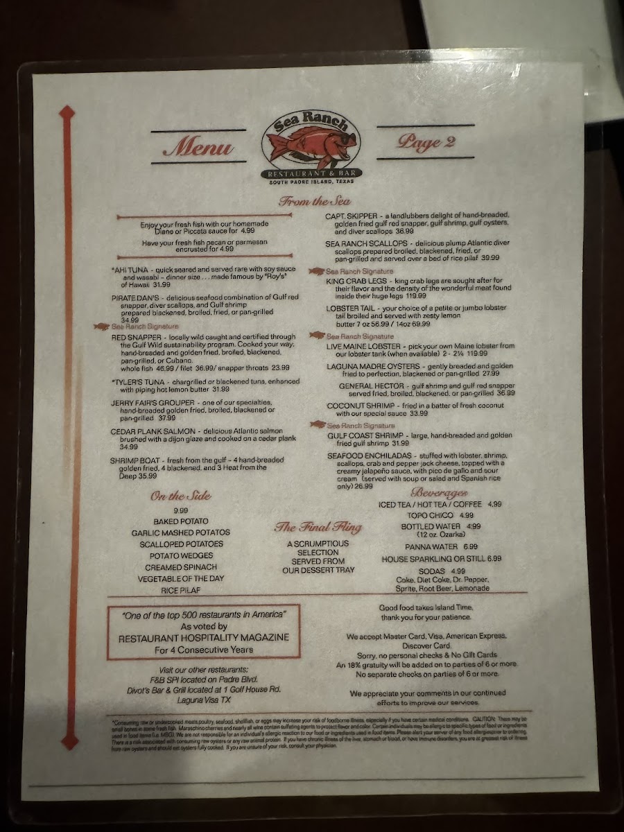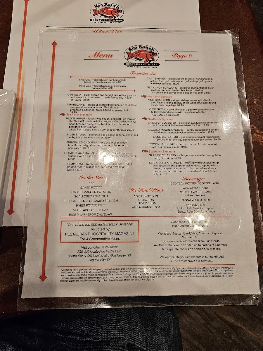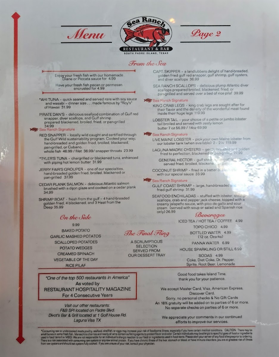At the heart of South Padre Island, you’ll find the delightful Sea Ranch Restaurant, a local favorite known for its coastal charm and delicious menu offerings. The moment you step inside, the relaxed atmosphere invites you to unwind and savor the wide variety of dishes available. From fresh seafood, perfectly prepared steaks, to flavorful sides, there’s something for every taste. Whether you're enjoying a laid-back lunch or a cozy dinner with loved ones, the Sea Ranch Restaurant Menu has all your cravings covered. Signature dishes feature a perfect balance of local flavors, and the daily specials are always worth exploring. You can’t go wrong with any choice here, as each dish is made with care and the freshest ingredients. Whether you’re a regular or first-time visitor, there’s a dish waiting to please every palate.